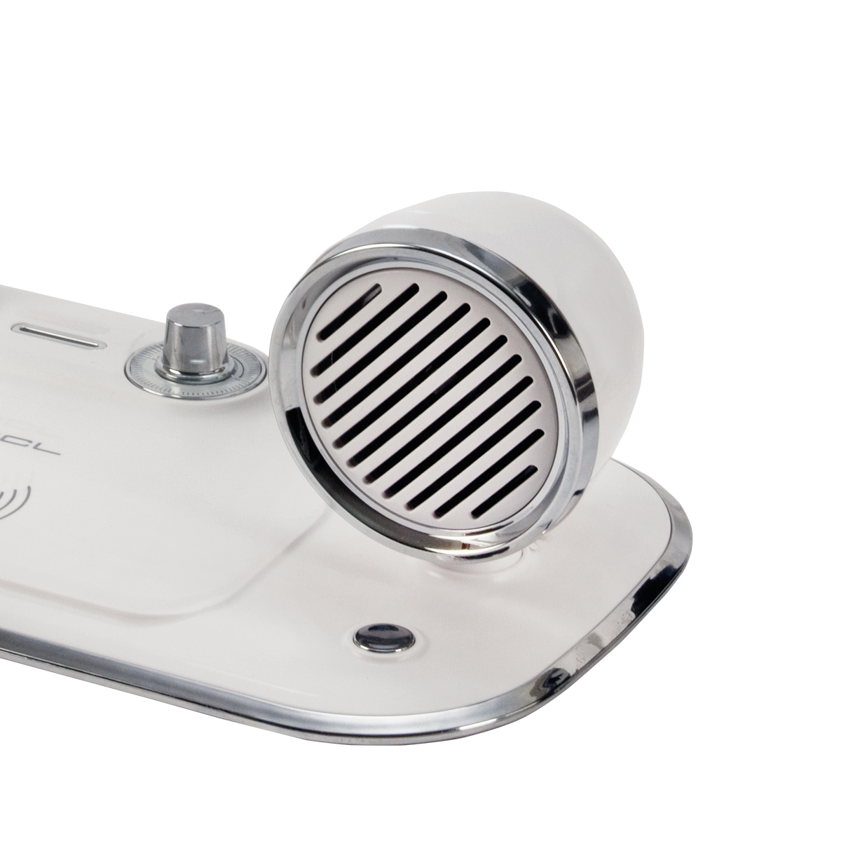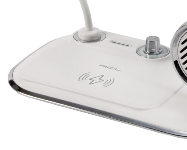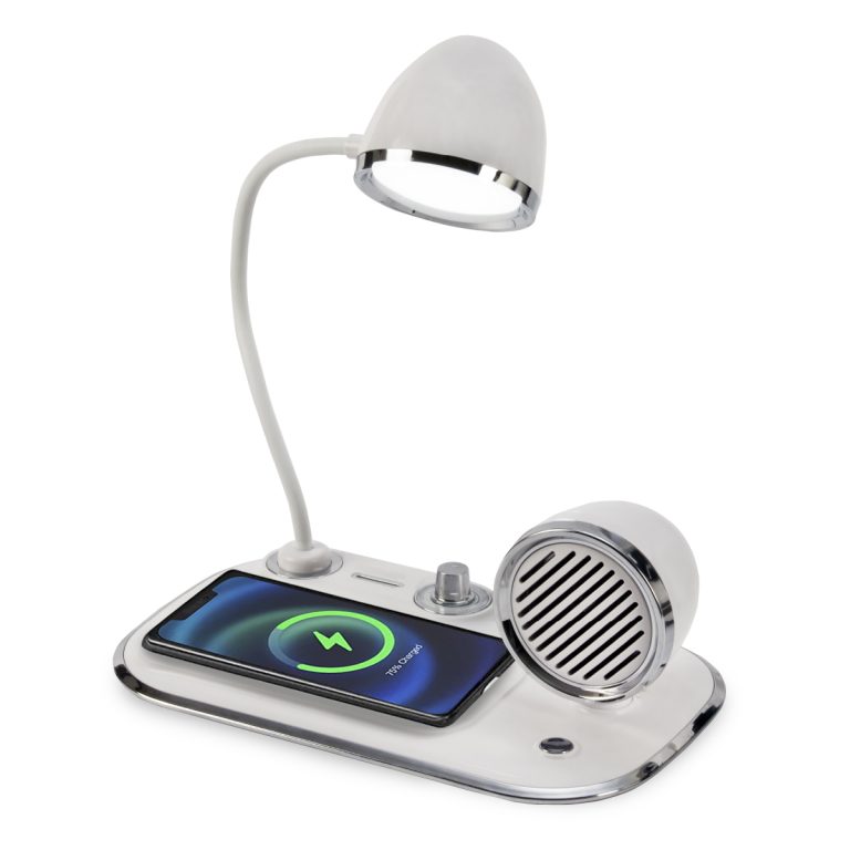 מעמד עם רמקול ומנורה לטעינה אלחוטית מהירה.